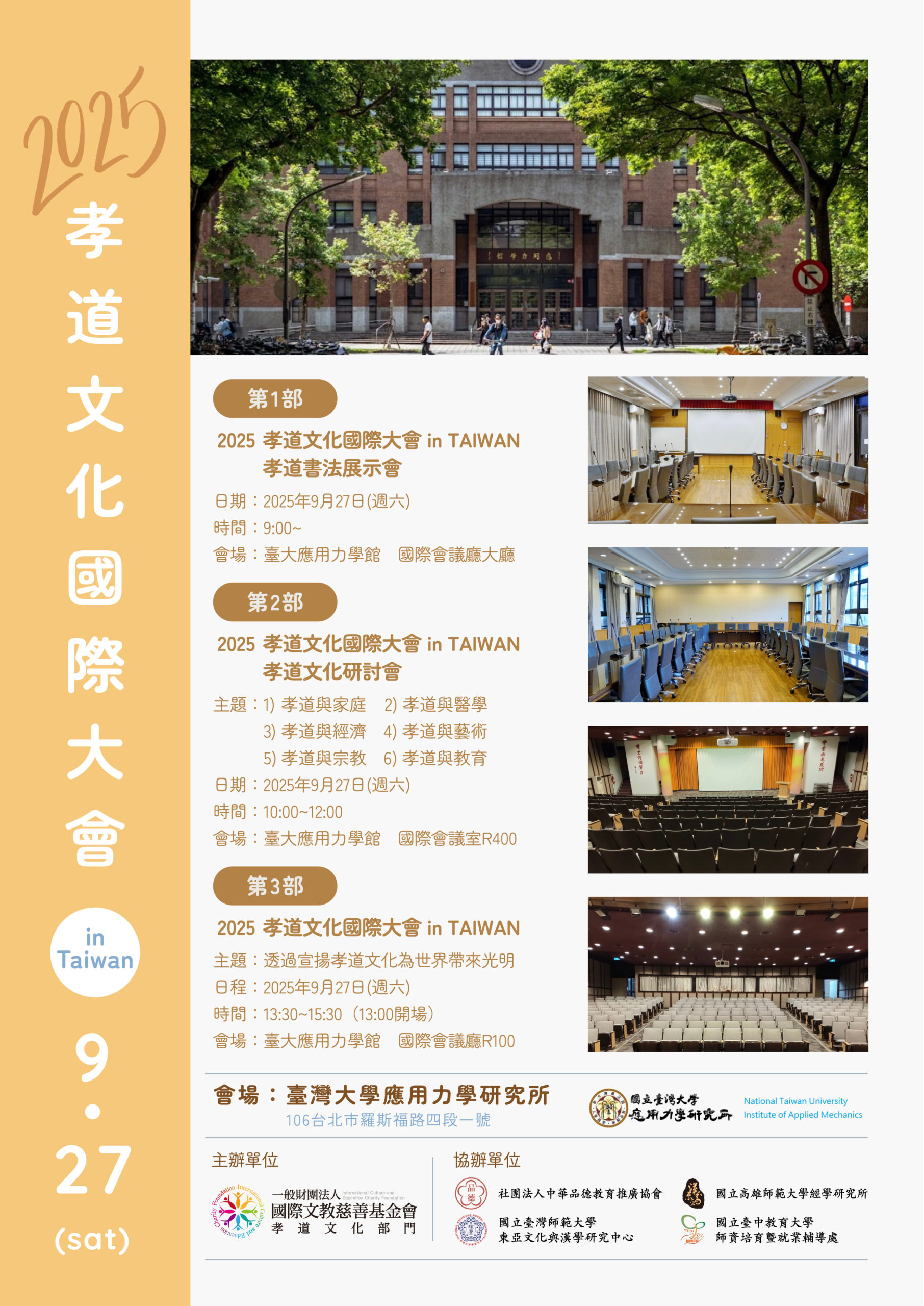 이번에 2025 효도문화 국제심포지엄과 2025 효도문화 국제대회를 2025년 9월 27일, 타이베이 대학교 응용역학연구소에서 개최하게 되었습니다.